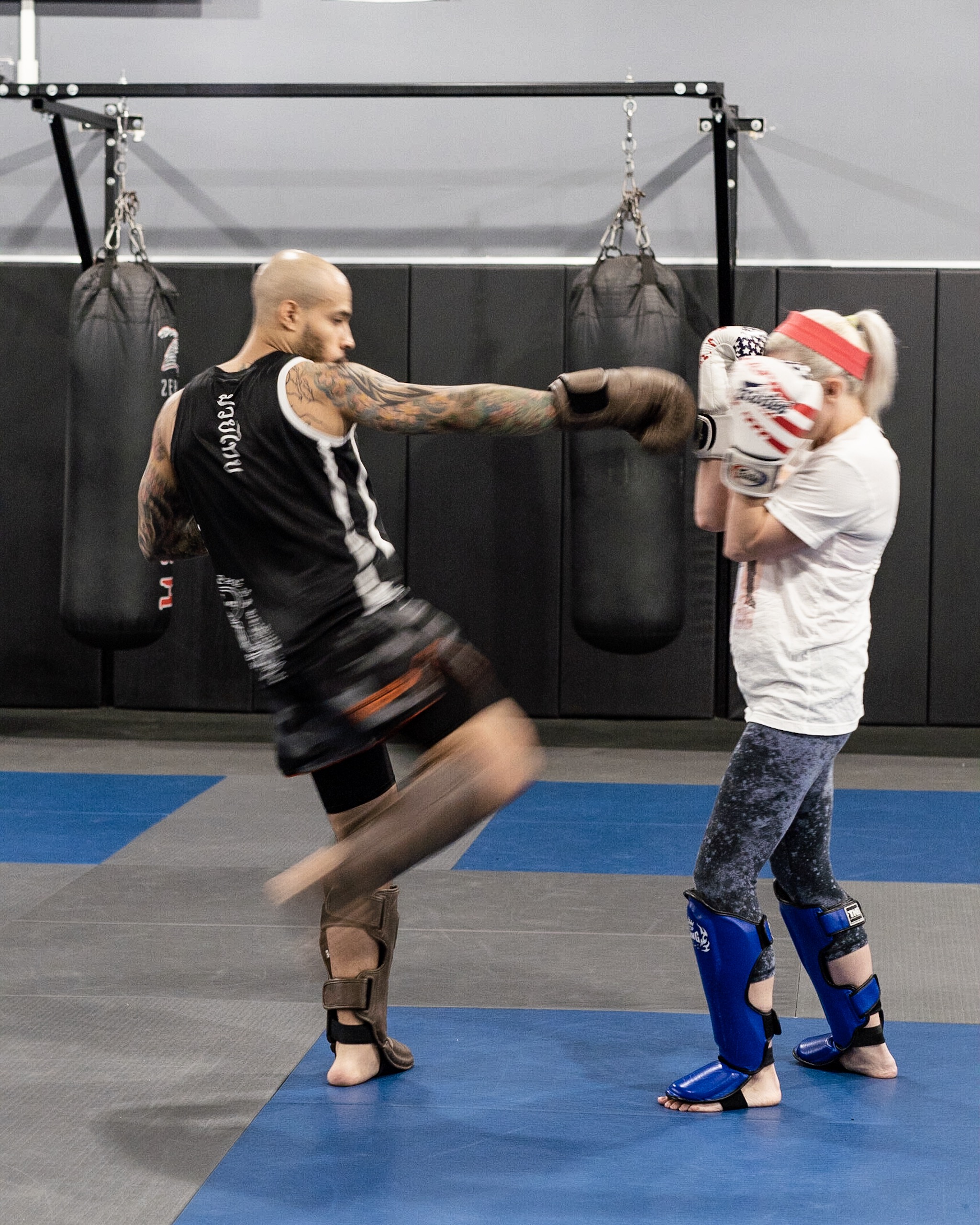 We want to be clear about this: Muay Thai classes are an amazing cardio workout. We teach the original “art of 8 limbs” which employs strikes and blocks using your entire body. At the end of a class, you will have drilled practical techniques of self defense and exercises for 45 minutes. It’s not uncommon to finish up breathing hard, sweating, and most importantly, smiling. Why? Because you’re empowering yourself, increasing strength, and engaging with a team in a common goal.
